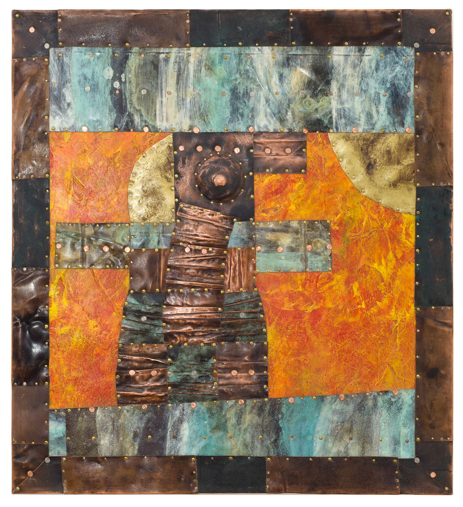 patinated copper, brass, acrylic, wooden board
